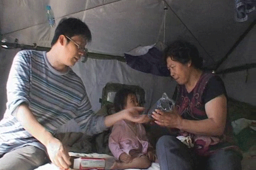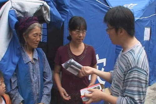 中央人民廣播電臺(tái)前方記者申玉彪向?yàn)?zāi)區(qū)群眾發(fā)放收音機(jī)