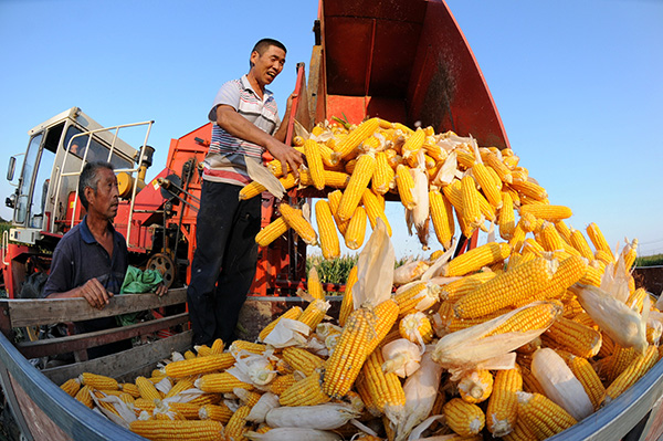9月29日,河北省任縣任城鎮西縣南村農民將收獲的玉米裝車。