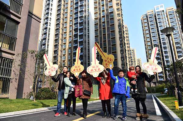 2月26日,回遷居民代表在小區里拿著“鑰匙”模型,慶祝回遷。