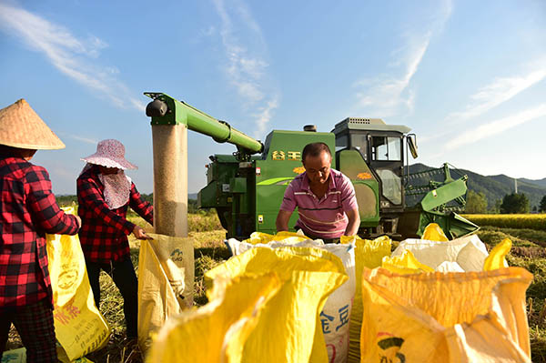 9月20日,在安徽涇縣晏公鎮(zhèn),農(nóng)民將剛收割的水稻裝袋。