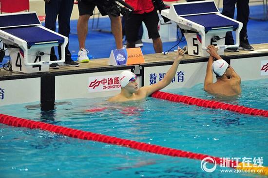 “能和我的教練一起站上領(lǐng)獎臺,我很高興。不過告訴你們一個小秘密,我的教練還有點小緊張。”為表彰教練員所作出的貢獻,這次全運會的頒獎環(huán)節(jié)都是教練員和運動員一起登臺領(lǐng)獎,汪順說,盡管這兩天有低燒,但在教練的調(diào)整下,自己能游出這樣的成績,非常滿意。